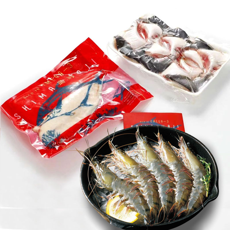 每份礼包含岛鲹纯臻鱼柳(300g/片)2片、岛鲹鱼下巴(500g/包)2包,活冻黑虎虾(15P,800g/盒)2盒